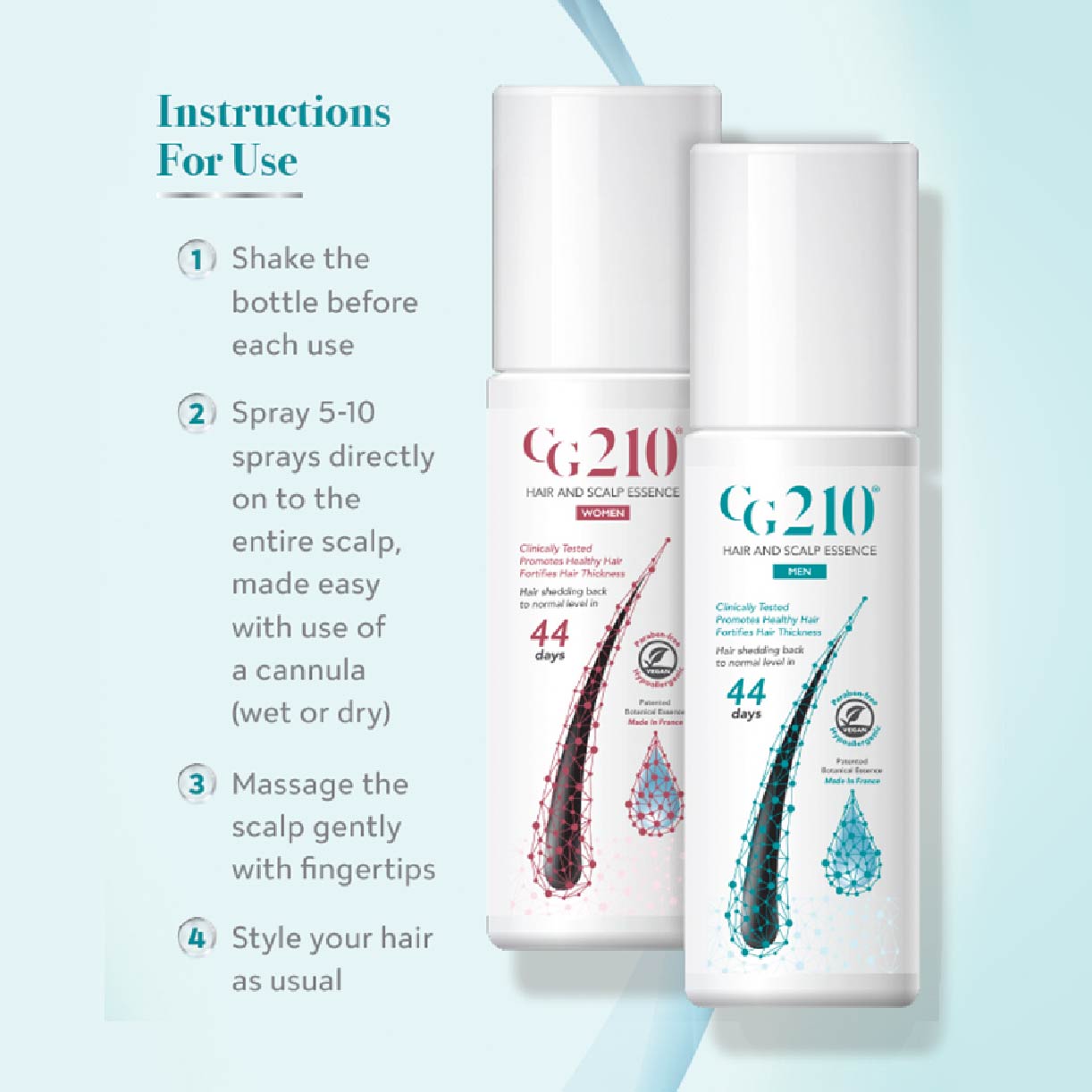 Step 2: Apply 5-10 sprays directly onto your entire scalp (wet or dry) using the cannula every morning and evening.
