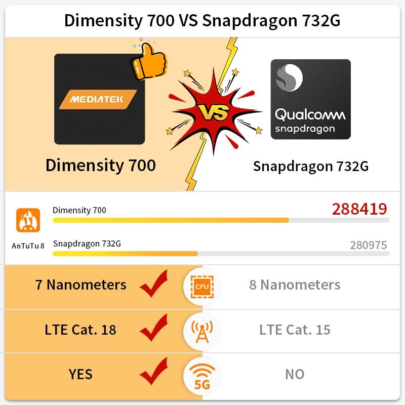 • CPU------------MTK Dimensity 700 Octa Core CPU, up to 2.2GHz